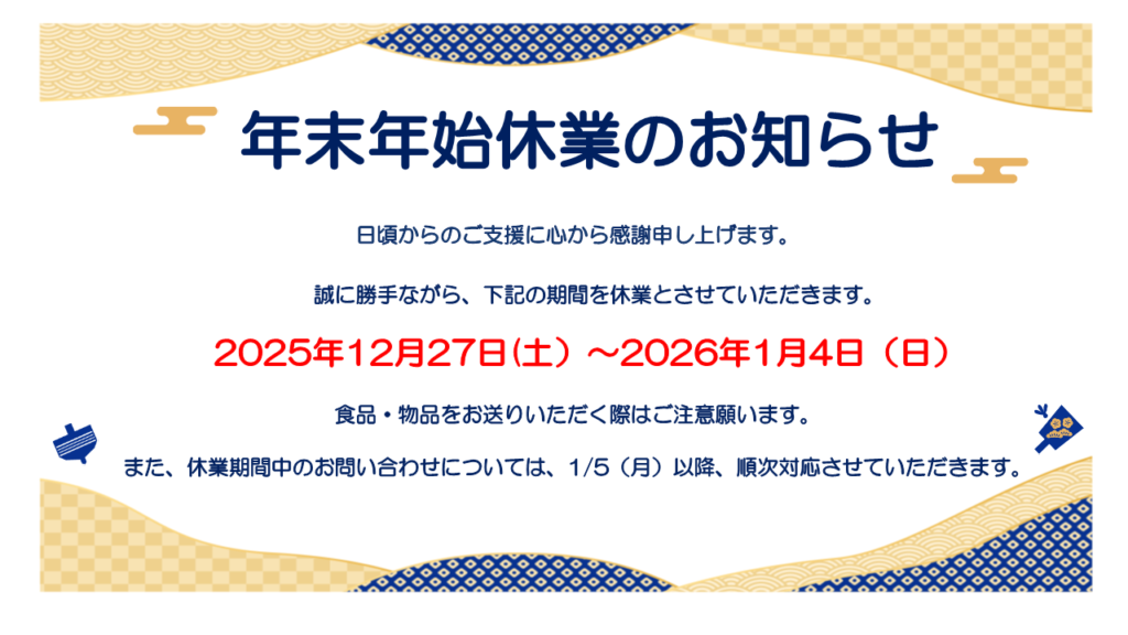年末年始休業のお知らせ 2025.12.22 Tweet Pocket 休業期間:2025年12月27日(土)~2026年1月4日(日) 食品・物品をお送りいただく場合の到着日は、上記期間を避けていただきますようよろしくお願いいたします。 また、休業期間中に各種お問い合わせをいただいた場合は、1/5(月)以降順次お返事を差し上げます。